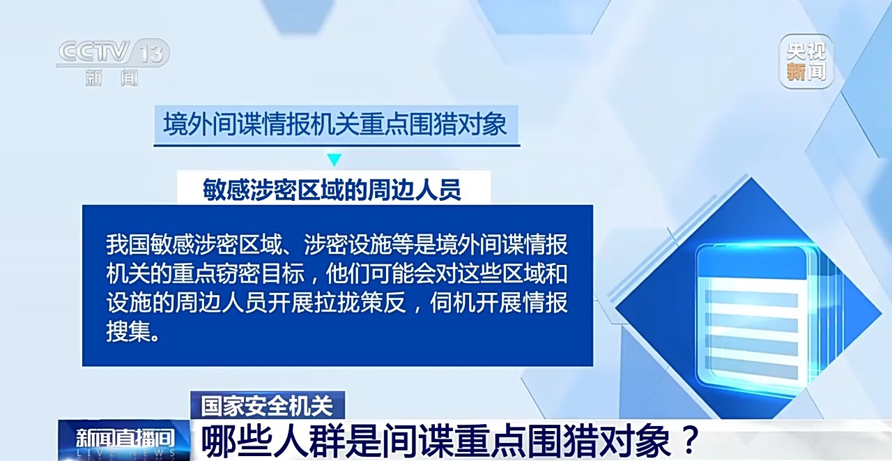 還有就是敏感涉密區域的周邊人員。我國敏感涉密區域、涉密設施等是境外間諜情報機關的重點竊密目標,他們可能會對這些區域和設施的周邊人員開展拉攏策反,伺機開展情報蒐集。