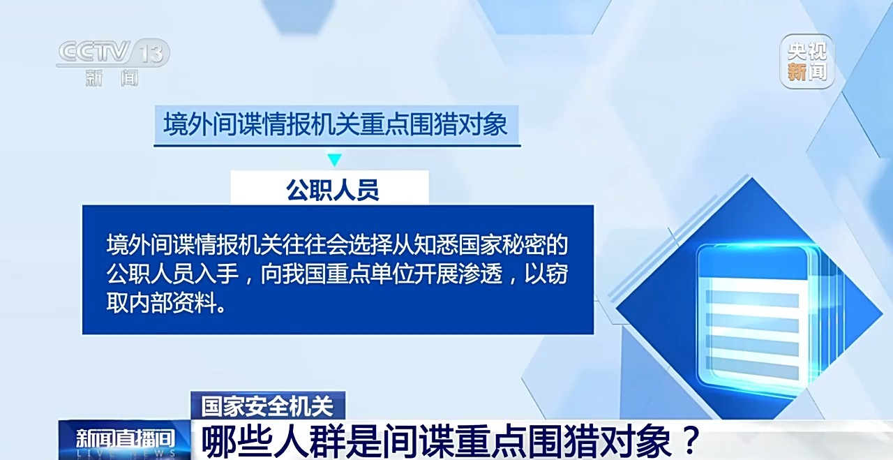 首先是我國的公職人員。境外間諜情報機關往往會選擇從知悉國家秘密的公職人員入手,向我國重點單位開展滲透,以竊取內部資料。