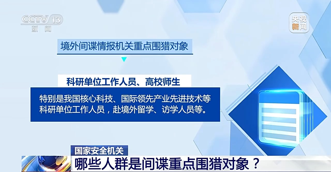科研單位工作人員、高校師生同樣是境外間諜情報機關重點拉攏策反的目標對象,特別是我國核心科技、國際領先產業先進技術等科研單位工作人員,赴境外留學、訪學人員等。