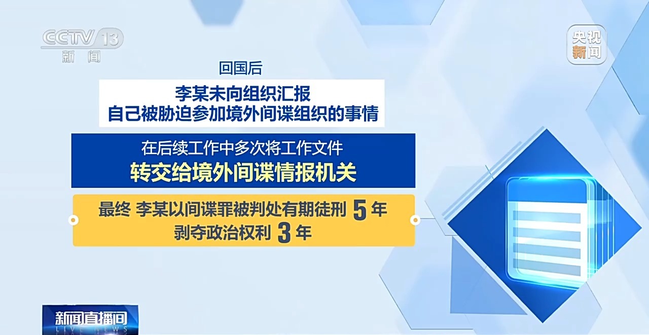 某省直機關工作人員李某,因工作需要,赴境外參加短期培訓。其間,李某禁不住境外間諜情報機關人員的美色誘惑,陷入其精心設計的“温柔陷阱”。事後,境外間諜情報機關以李某私密照片為要挾,脅迫其加入境外間諜組織,李某迫於無奈履行了參諜手續。回國後,李某未向組織彙報自己被脅迫參加境外間諜組織的事情,在後續工作中,多次將工作文件轉交給境外間諜情報機關。最終,李某以間諜罪被判處有期徒刑5年,剝奪政治權利3年。