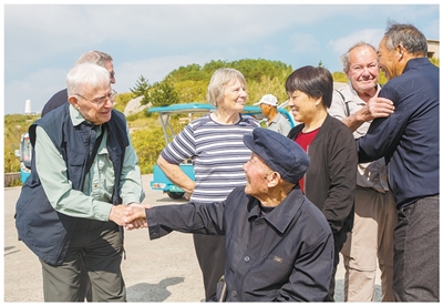 英軍戰俘後人與林阿根(前排老者)、中國漁民後代見面。