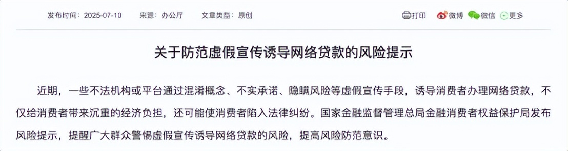 【環球網財經綜合報道】7月10日,國家金融監督管理總局網站發佈《關於防範虛假宣傳誘導網絡貸款的風險提示》,提醒廣大消費者警惕近期不法機構或平台通過虛假宣傳手段誘導辦理網絡貸款的行為。