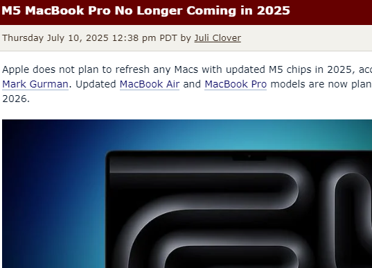 【環球網科技綜合報道】據外媒7月11日消息,蘋果原計劃2025年末推出的M5版MacBook Pro將推遲至2026年,MacBook Air的M5版本更新也同步延後。