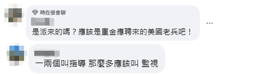 對此,有島內網友質疑稱,“是派來的嗎?應該是重金應聘來的美國老兵吧!”“一兩個叫指導,那麼多應該叫監視”。