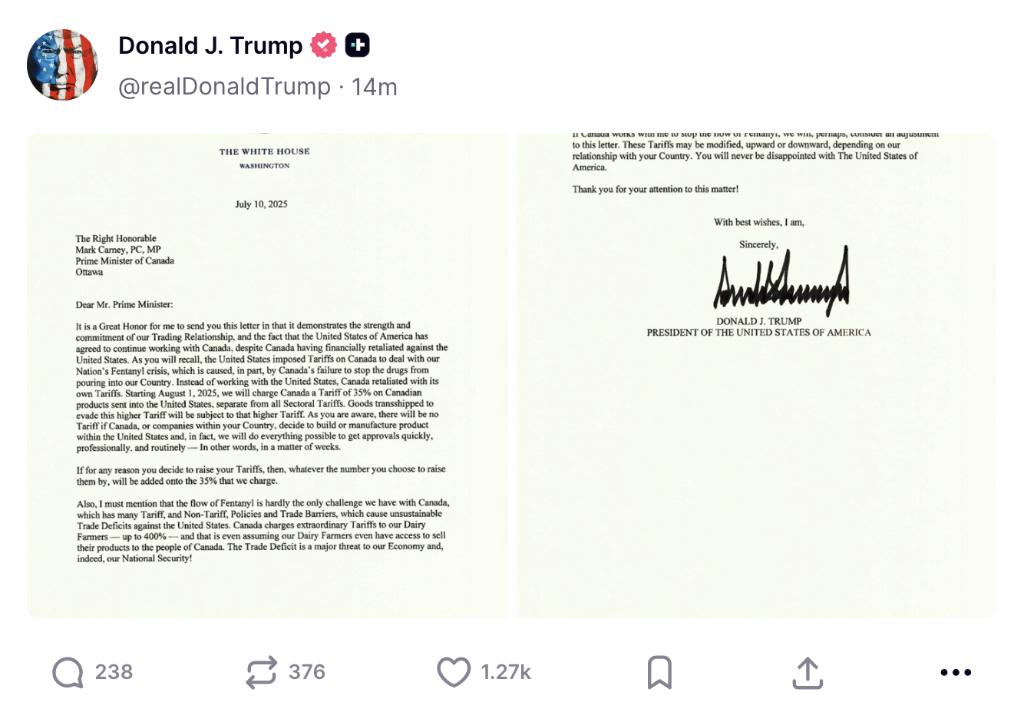 特朗普當天是在致加拿大總理卡尼的信函中宣佈上述舉措的。這封信同時公佈在社交媒體平台“真實社交”上。