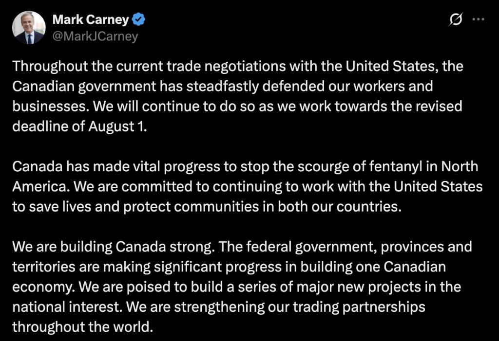卡尼在社交媒體上説,在當前與美國的貿易談判中,加拿大政府一直堅定地維護本國工人和企業的利益。“我們將繼續這樣做,並朝着8月1日這一修訂後的最後期限而努力。”