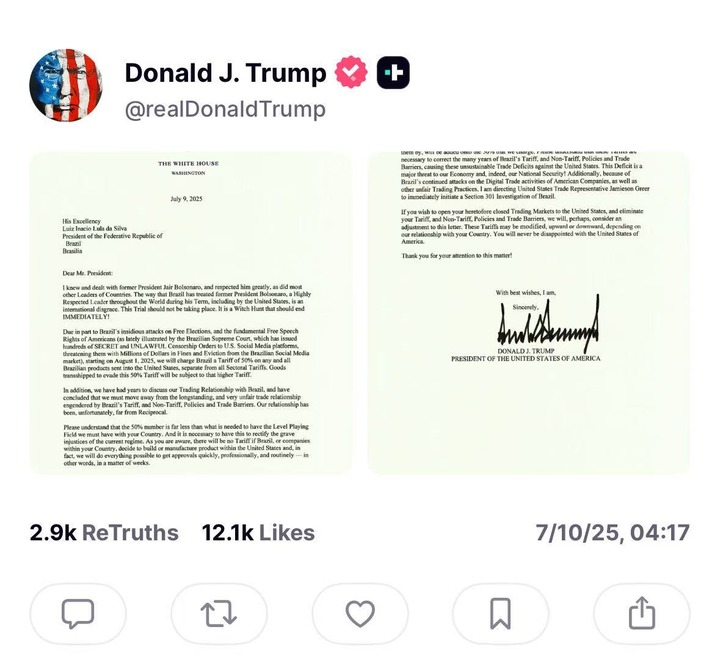 這是特朗普在社交媒體上發佈致盧拉信函的截圖。