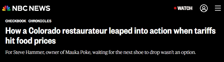 據美國全國廣播公司新聞(NBC News)報道,美國政府宣佈所謂“對等關税”當天,科羅拉多州鷹鎮餐廳老闆史蒂夫·哈默緊急採購了7箱共200磅的金槍魚。“那天我可能多了一萬根白髮,完全慌了神。”他回憶説。廚房經理雖對其塞滿冰箱的行為頗有微詞,但哈默解釋此舉是為規避關税生效後的漲價風險。