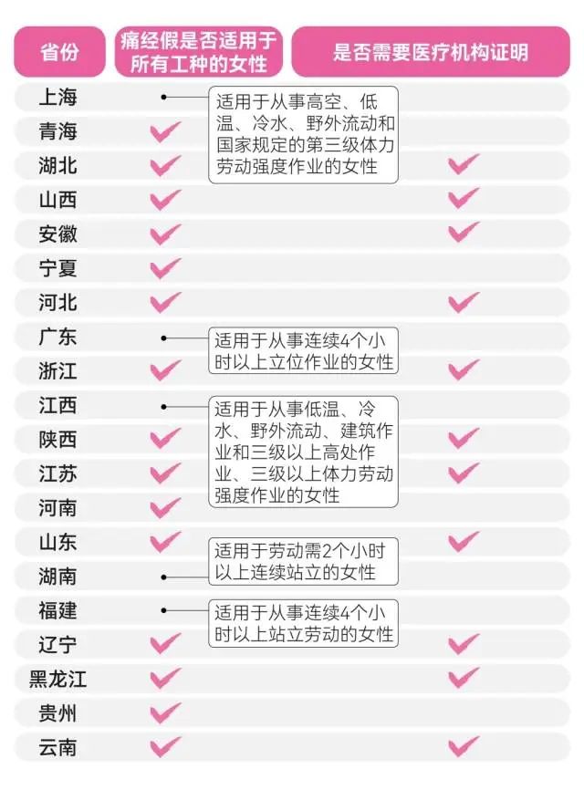 *各地“痛經假”的區別主要涉及兩個方面:*適用的工種範圍和是否需要醫療證明。
