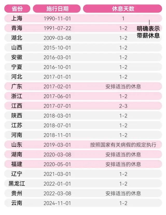 據統計*全國目前已有20個省份實行“痛經假”。*各地情況如下: