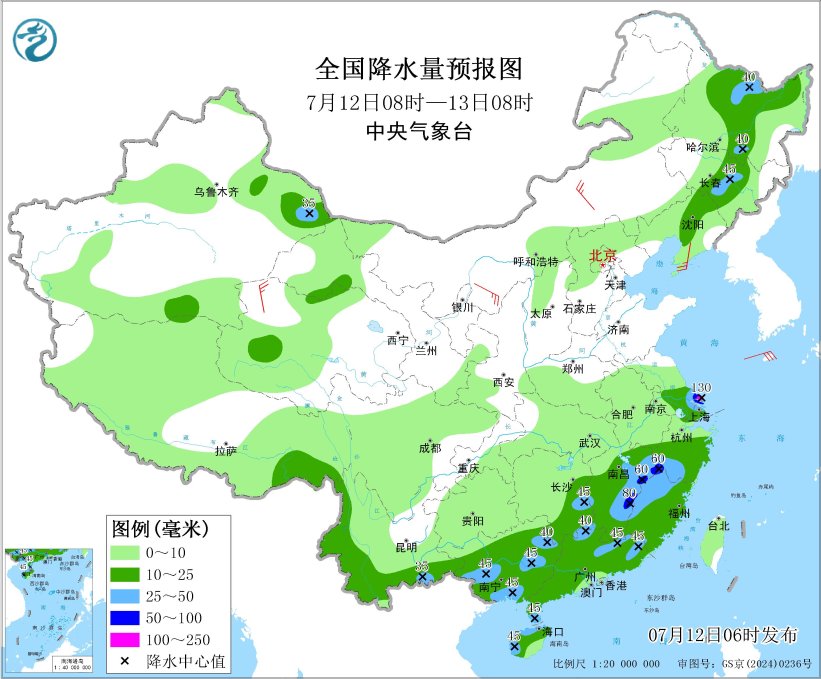 *7月12日08時至13日08時,*東北地區中部、新疆東部、江南大部、西南地區南部、華南大部等地部分地區有中到大雨,其中,江蘇東南部、上海、江西東部、浙江西部、福建西北部等地部分地區有暴雨,江蘇東南部局地有大暴雨(100~130毫米)。內蒙古中西部、遼東半島等地部分地區有4~5級風(見圖1)。黃海南部、東海北部海域將有5~6級風,陣風7級。