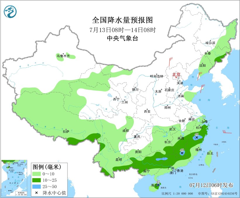 7月12日至13日,江南東部和南部、華南、雲南西部和南部、江淮東部等地部分地區有中到大雨,局地暴雨。