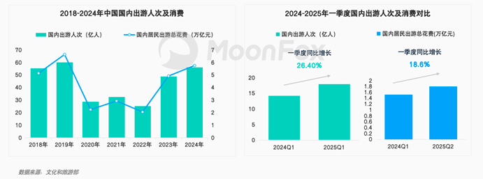 在政策、技術、經濟及社會環境多重利好疊加下,中國旅遊業在2025年延續了復甦態勢。從具體數據來看,2024年國內出遊人次達56.15億、旅遊總花費5.75萬億,平均每人次出遊花費提升至1024元,實現“人次+消費”雙增長;2025年一季度,出遊人次同比增速達26.40%、消費增速18.6%,持續釋放復甦活力,研學、康養等服務型消費快速增長,印證行業增長新週期的開啓。
