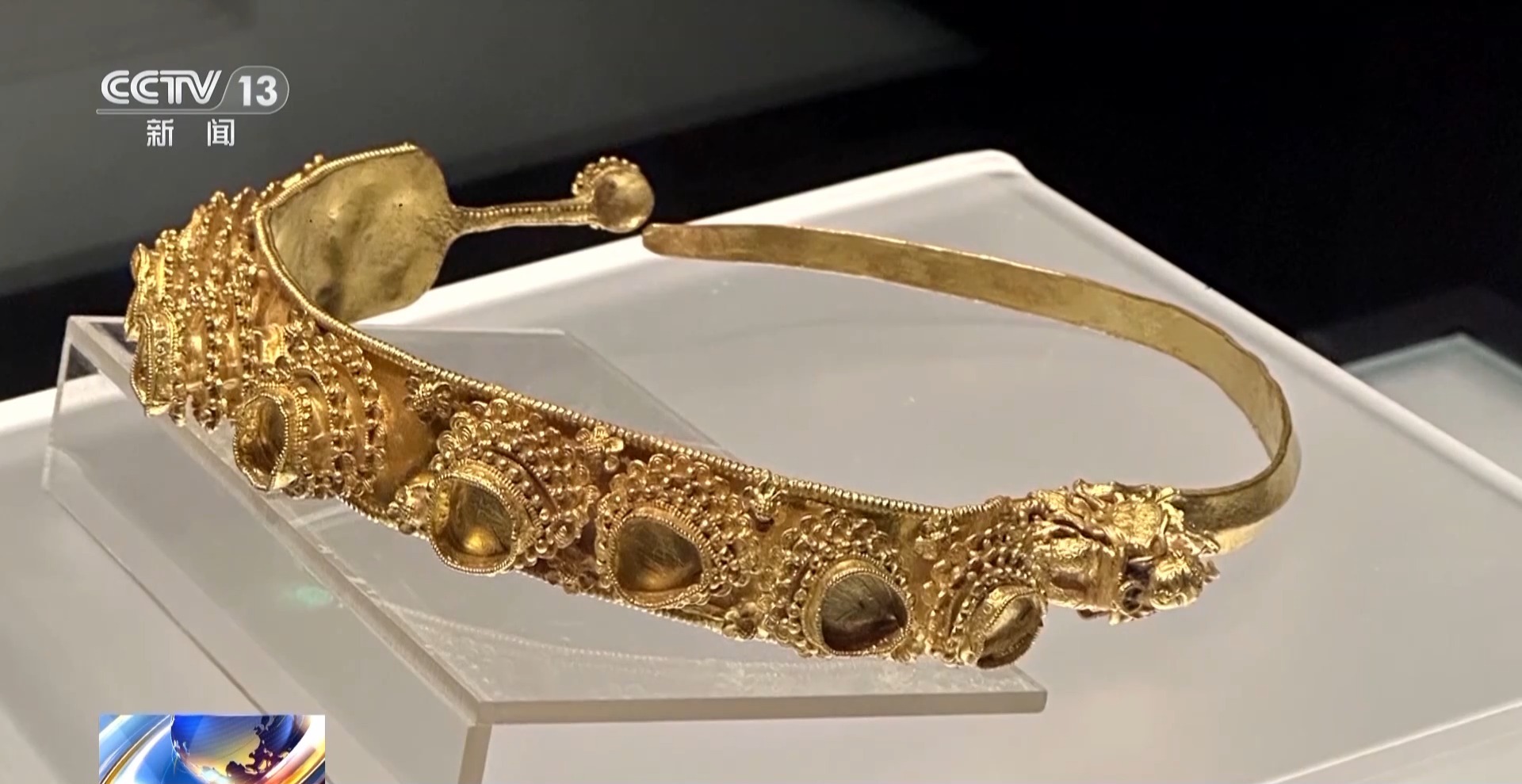 陳列於西夏陵博物館的這件金頭飾也吸引了眾多目光,重量達到200多克,使用大量蓮瓣、聯珠紋進行裝飾,蓮瓣聯珠紋在唐宋文化中象徵着吉祥,呈現出濃厚的中原文化底藴,是極為罕見的金頭飾精品。金頭飾中間還有9個推測是鑲嵌寶石的基座,但寶石出土時就已脱落不存在。