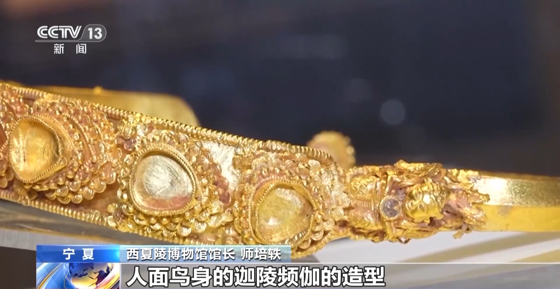 *西夏陵博物館館長 師培軼:*它的側面,還有一個人面鳥身的迦陵頻伽的造型,應該説是西夏高超的金器製造水平的一個真實體現。