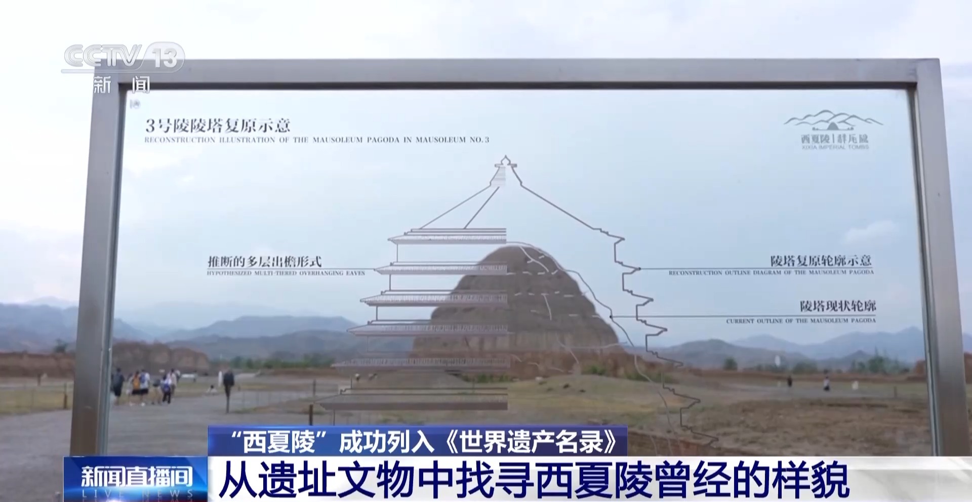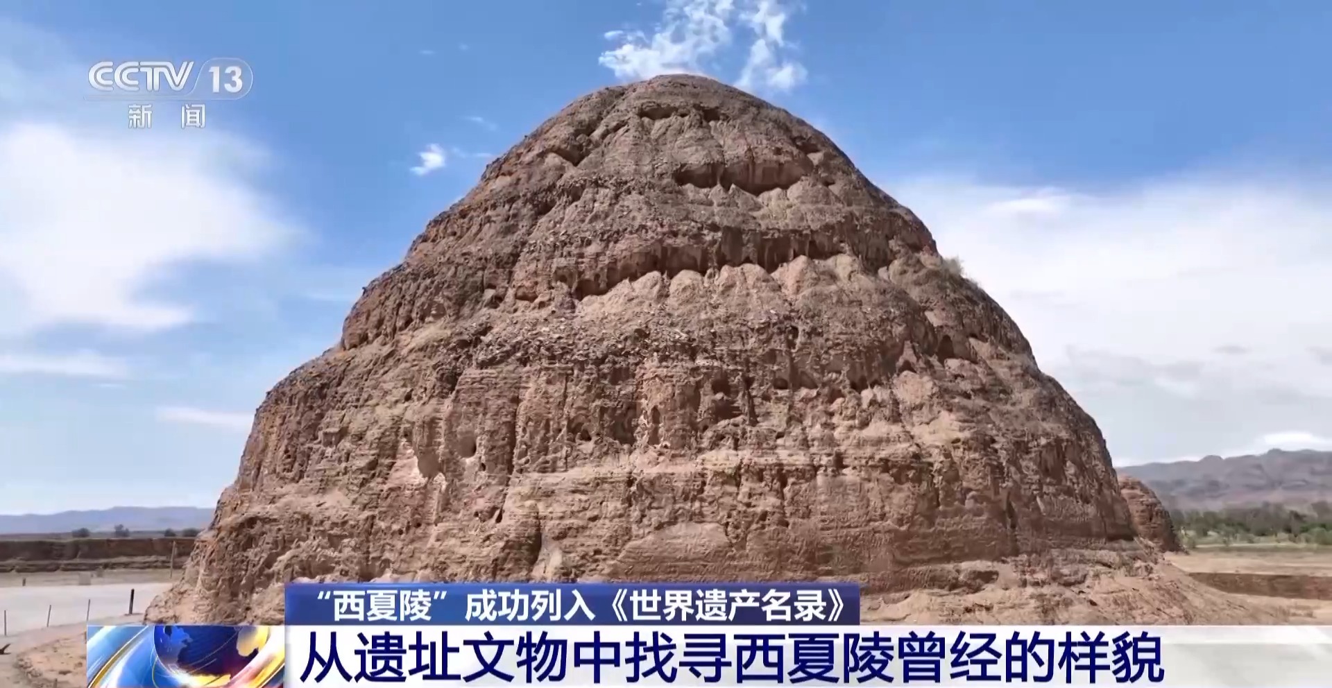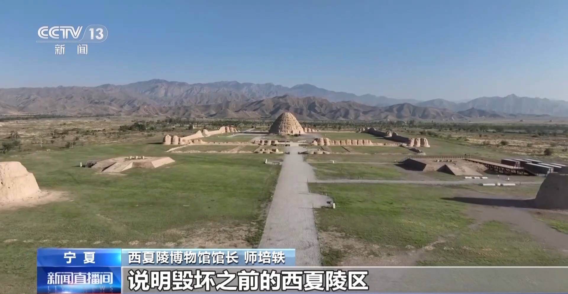 *總枱央視記者 任梅梅:*在賀蘭山下可以看到一座座高聳的圓錐形土堆,這裏就是西夏陵。這片廣闊的陵區由9座帝陵和271座陪葬墓組成,是西夏時期保存至今規模最大、等級最高,保存完好的考古遺存。