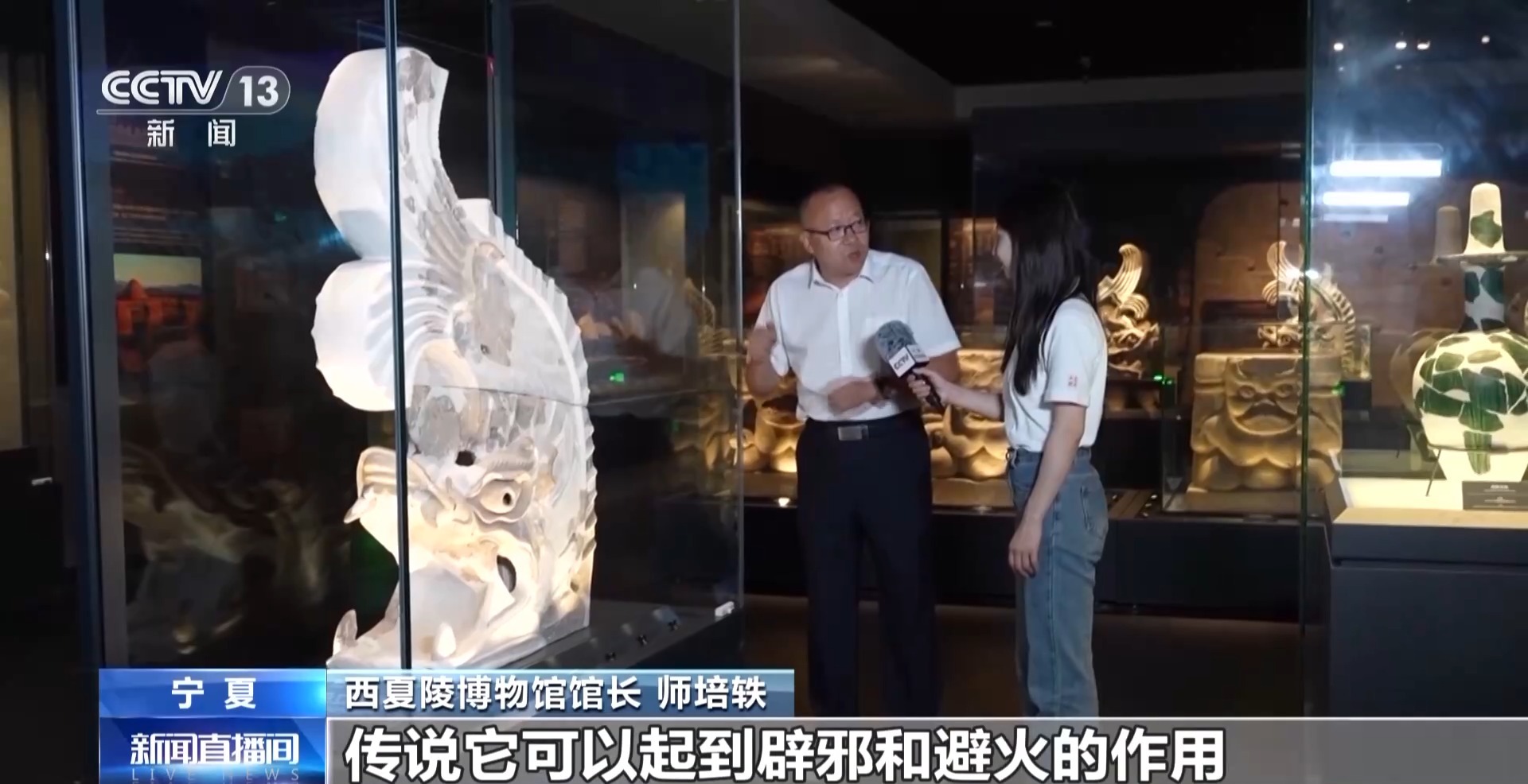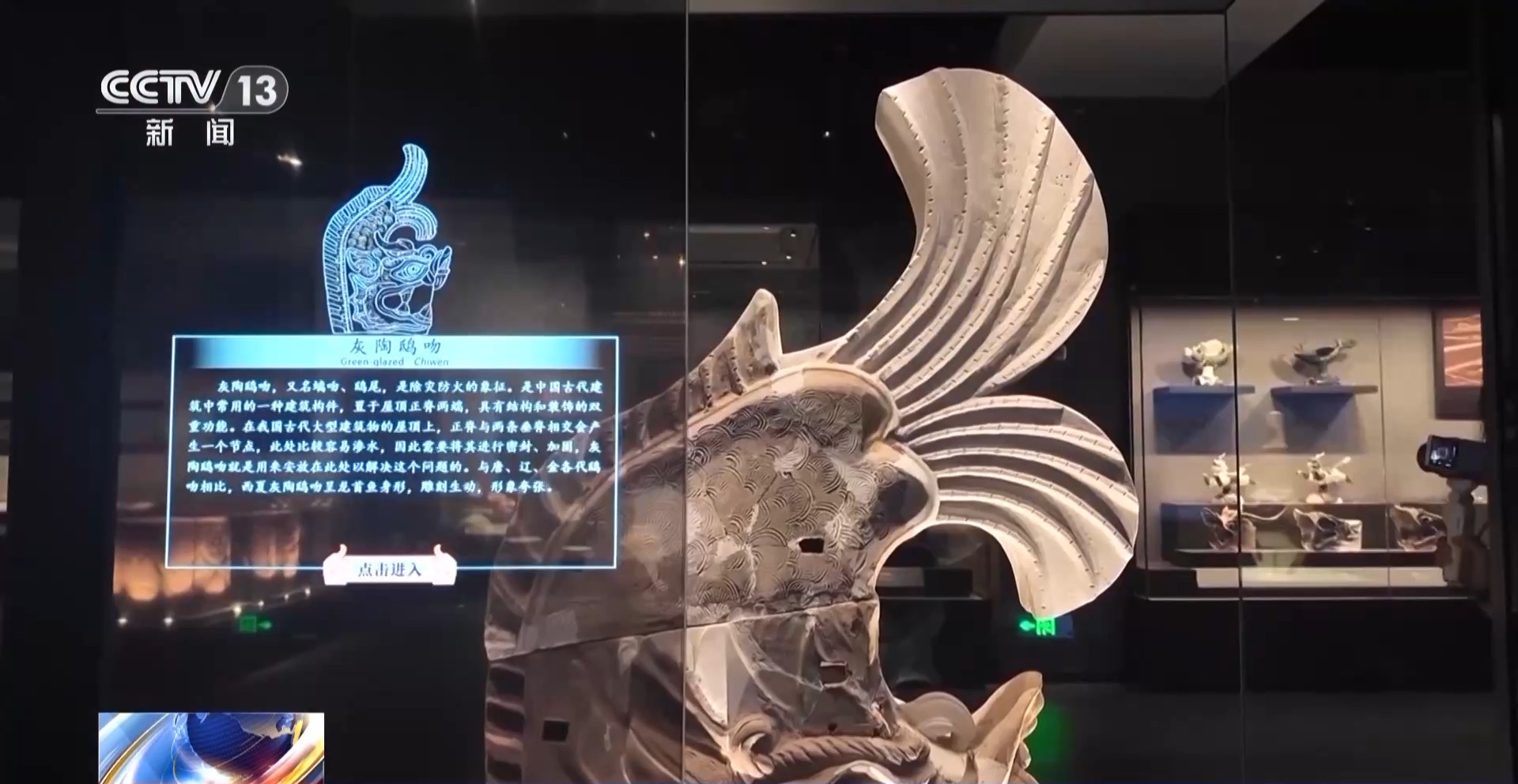 *西夏陵博物館館長 師培軼:*鴟吻在中國古代建築是房屋正脊兩頭的一個重要的裝飾物,傳説它可以起到辟邪和避火的作用。包括鴟吻在內,西夏陵發現了大量的精美的建築構件,包括各式各樣的瓦當滴水、反映中原建築影響的像套獸、鴟吻,還有能夠體現佛教對於陵園建築影響的,比如説像摩羯,像人面鳥身的迦陵頻伽等。發現了很多石雕力士志文支座,相當於是碑文的底座,這種體量的大約在1噸以上。