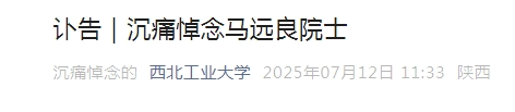 中國共產黨優秀黨員,中國工程院院士,我國水聲工程、信息科學和水中兵器領域傑出的科學家與教育家,航空聲吶領域的開拓者和奠基人,西北工業大學航海學院教授、博士生導師馬遠良同志,因病醫治無效,於2025年7月11日12時14分在西安逝世,享年87歲。