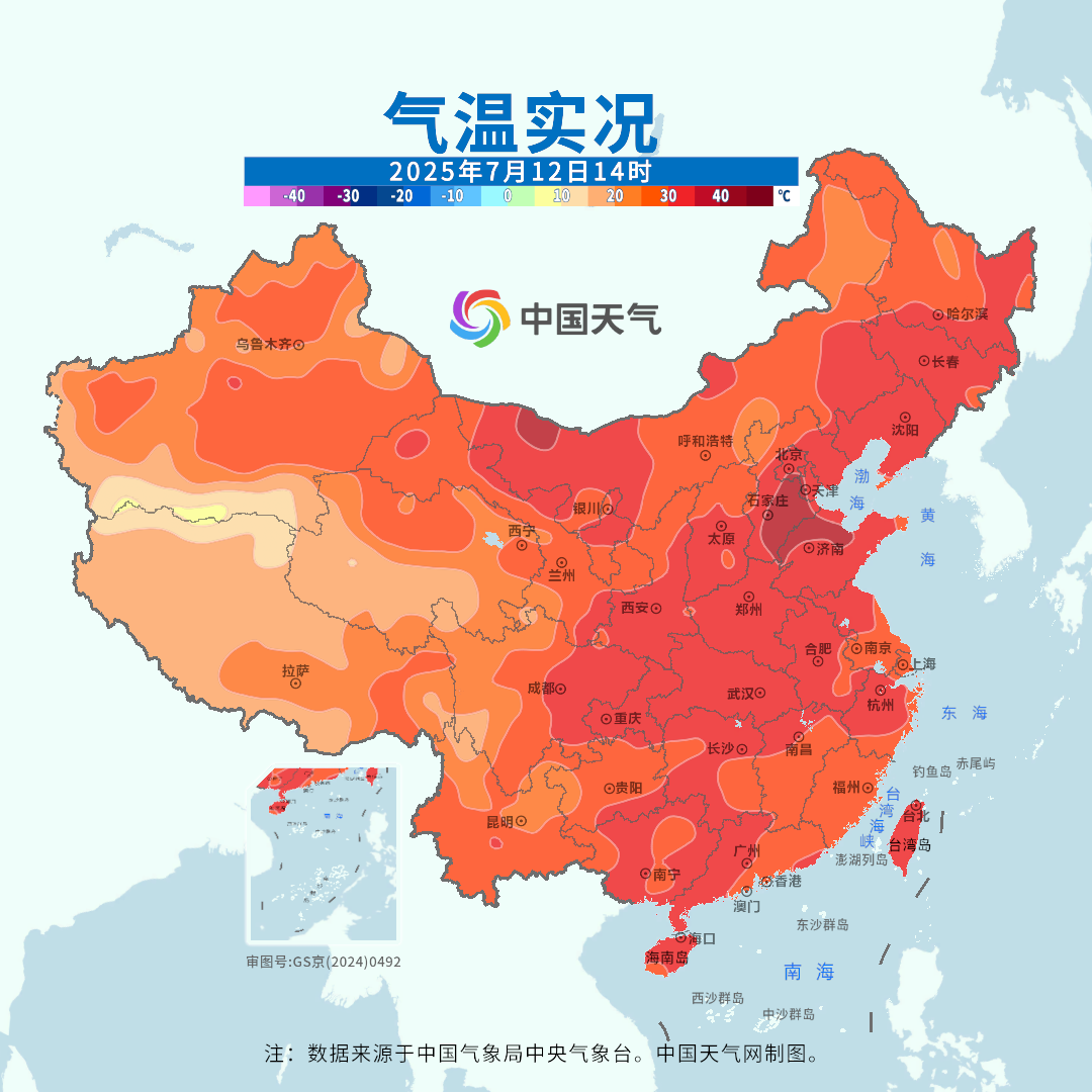 今天(7月12日)起,一場全國大範圍的高温高濕“桑拿天”天氣再一次拉開帷幕。高温率先從華北、黃淮一帶發展起來,今天14時,東北大部到華南氣温多在35℃以上,山東、河北多地體感温度更是在40℃以上,悶熱無比。