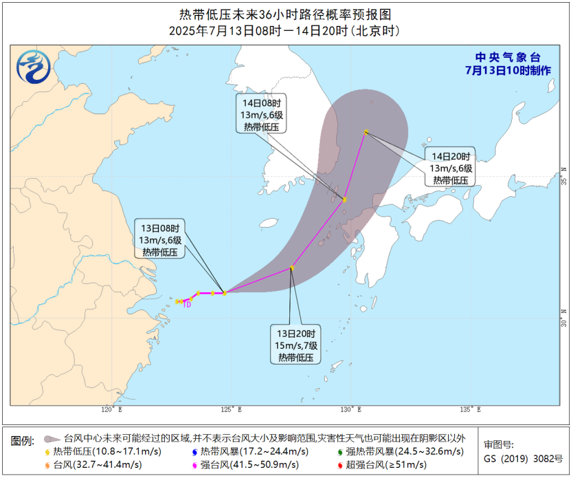 預計,該低壓將以每小時20至25公里的速度向東偏北方向移動,強度維持或略有增強,逐漸向朝鮮海峽靠近。受其影響,今天東海大部、黃海南部的部分海域將有6至7級大風,陣風可達8至9級。