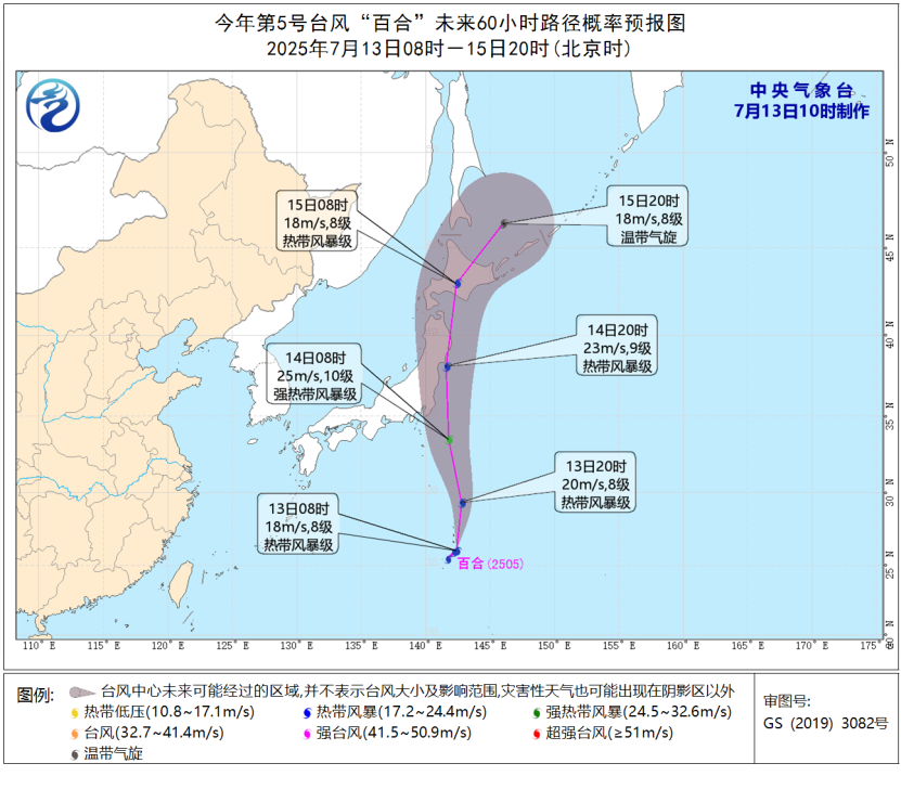 預計,“百合”將以每小時30至35公里的速度向偏北方向快速移動,強度逐漸增強,逐漸向日本東部一帶沿海靠近。未來“百合”對我國無影響。