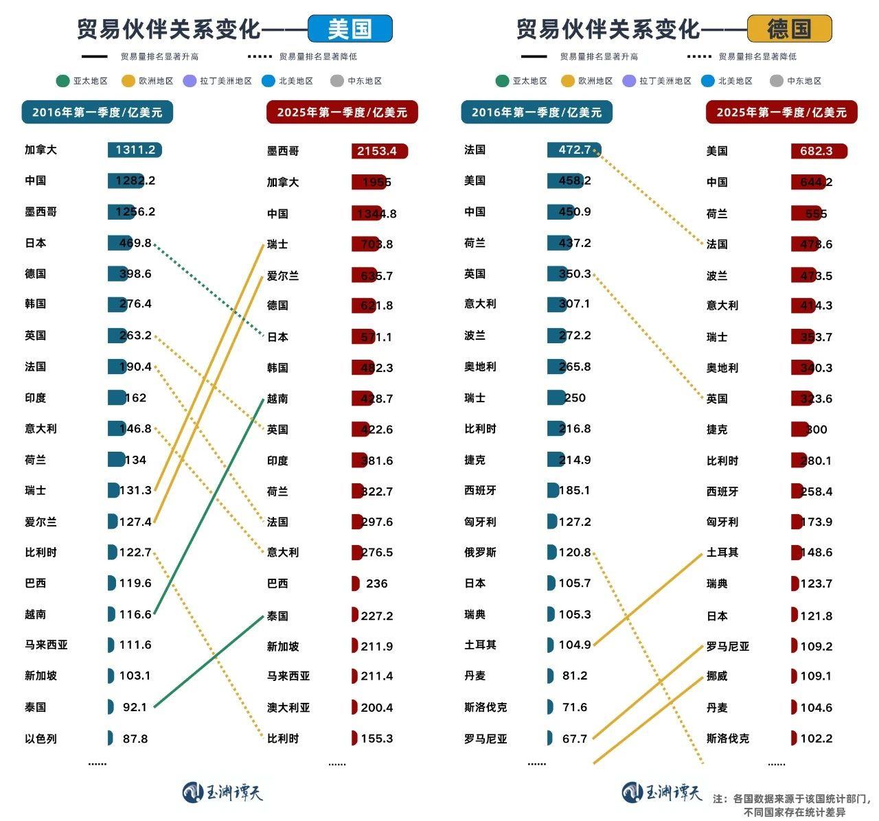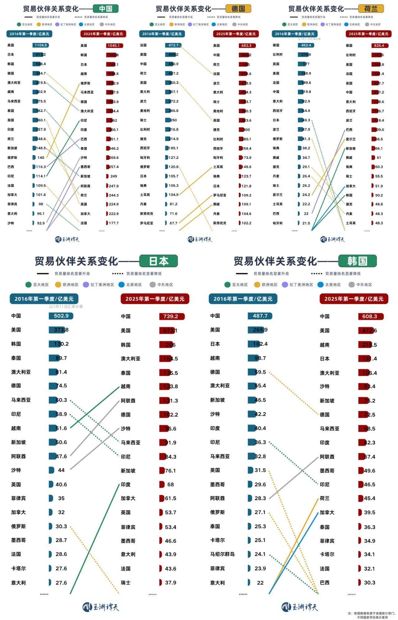 一眼看過去,增長的實線顏色不少,許多國家都在尋求新的貿易伙伴,而虛線顯示,傳統貿易伙伴的相對重要性在下降。國際貿易格局正在變得更加多元。