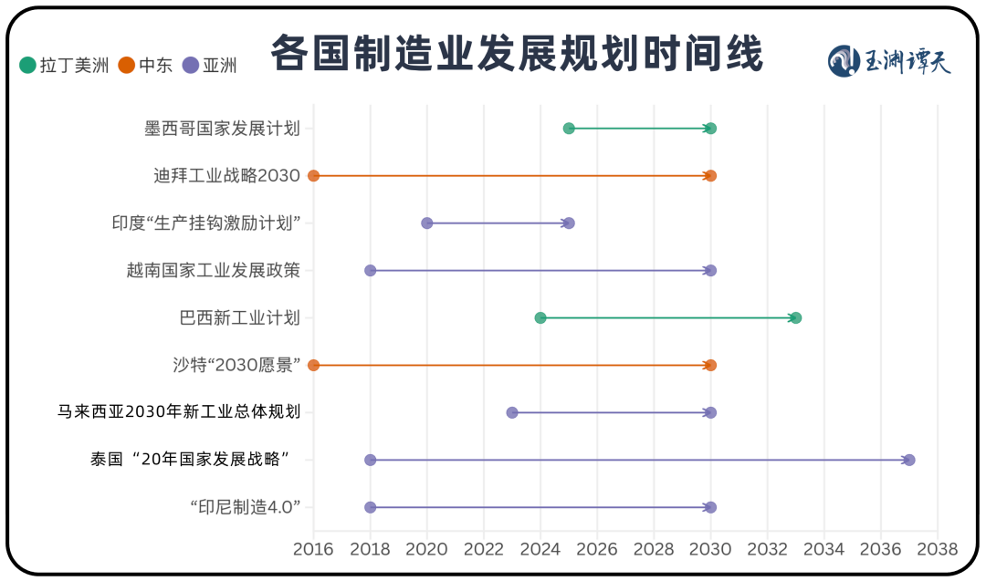 如果將製造業發展規劃作為評估戰略規劃能力的指標,會發現,阿聯酋、沙特等中東國家的發展規劃早在2016年,貿易保護主義剛剛抬頭時,就已經推出。