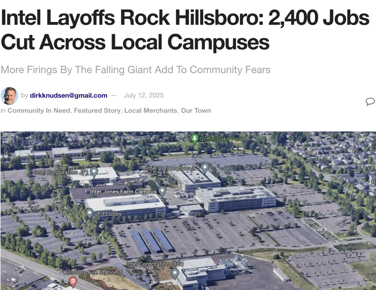 【環球網科技綜合報道】7月13日消息,據hillsboroherald報道稱,英特爾將在俄勒岡州希爾斯伯勒及阿羅哈園區裁減約2400名員工,裁員規模遠超此前公佈的529人。此次行動涉及芯片設計、工藝工程、設備維護、數據科學及軟件開發等關鍵崗位,裁員比例佔英特爾在俄勒岡州員工總數的10%以上。