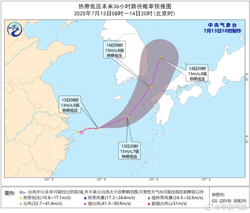 目前這個熱帶低壓位於舟山市東偏北方向的東海北部海面上,未來將快速向東偏北方向移動,趨向朝鮮海峽,遠離我市。