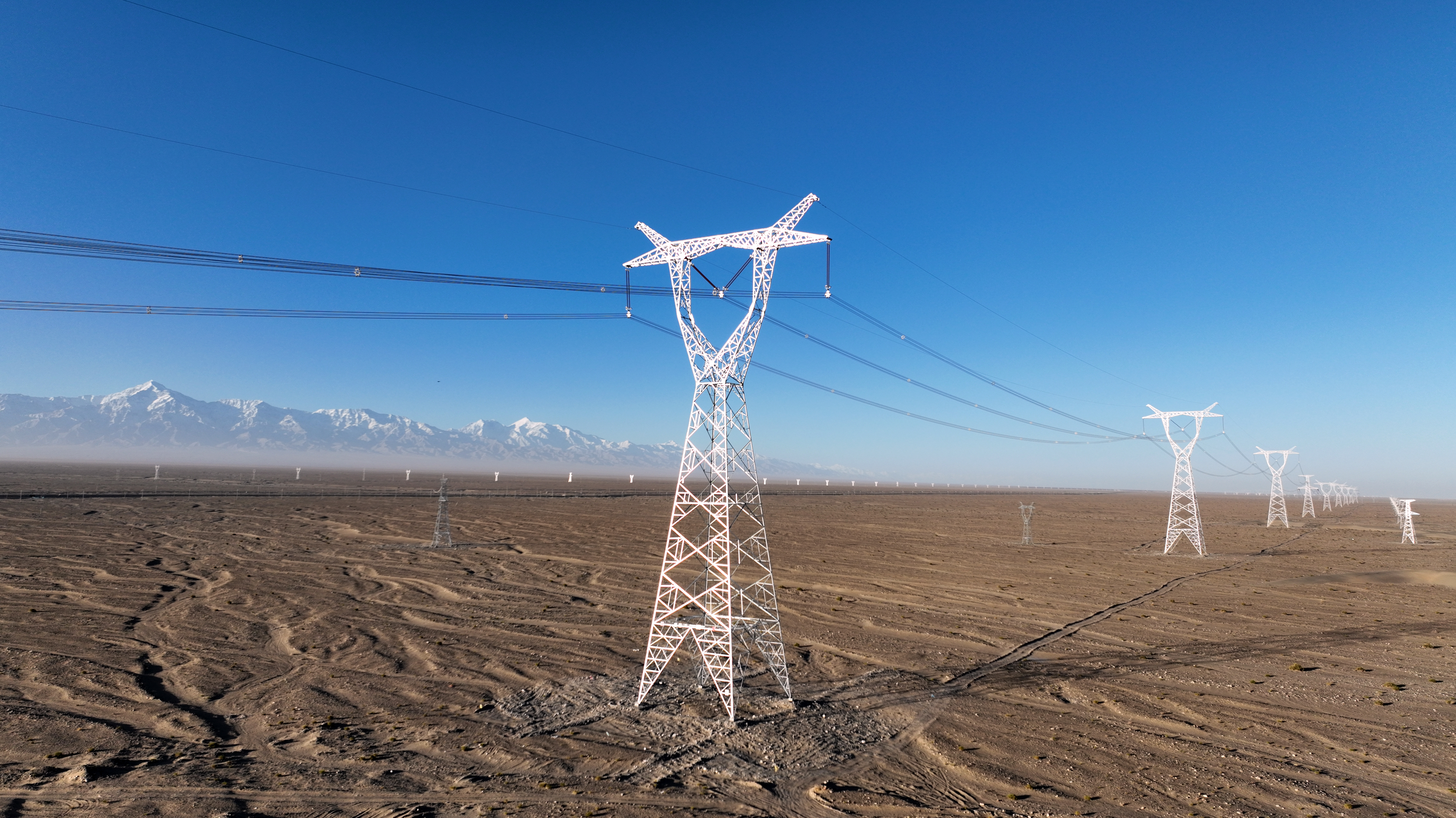 13日,新疆和田地區民豐縣,牽引機將最後一段電線從183號鐵塔拽至188號鐵塔,和田-民豐-且末-若羌750千伏輸變電工程實現全線貫通,這標誌着歷時15年建設,我國最大750千伏超高壓環網工程——新疆環塔里木盆地750千伏輸變電工程“合龍”。