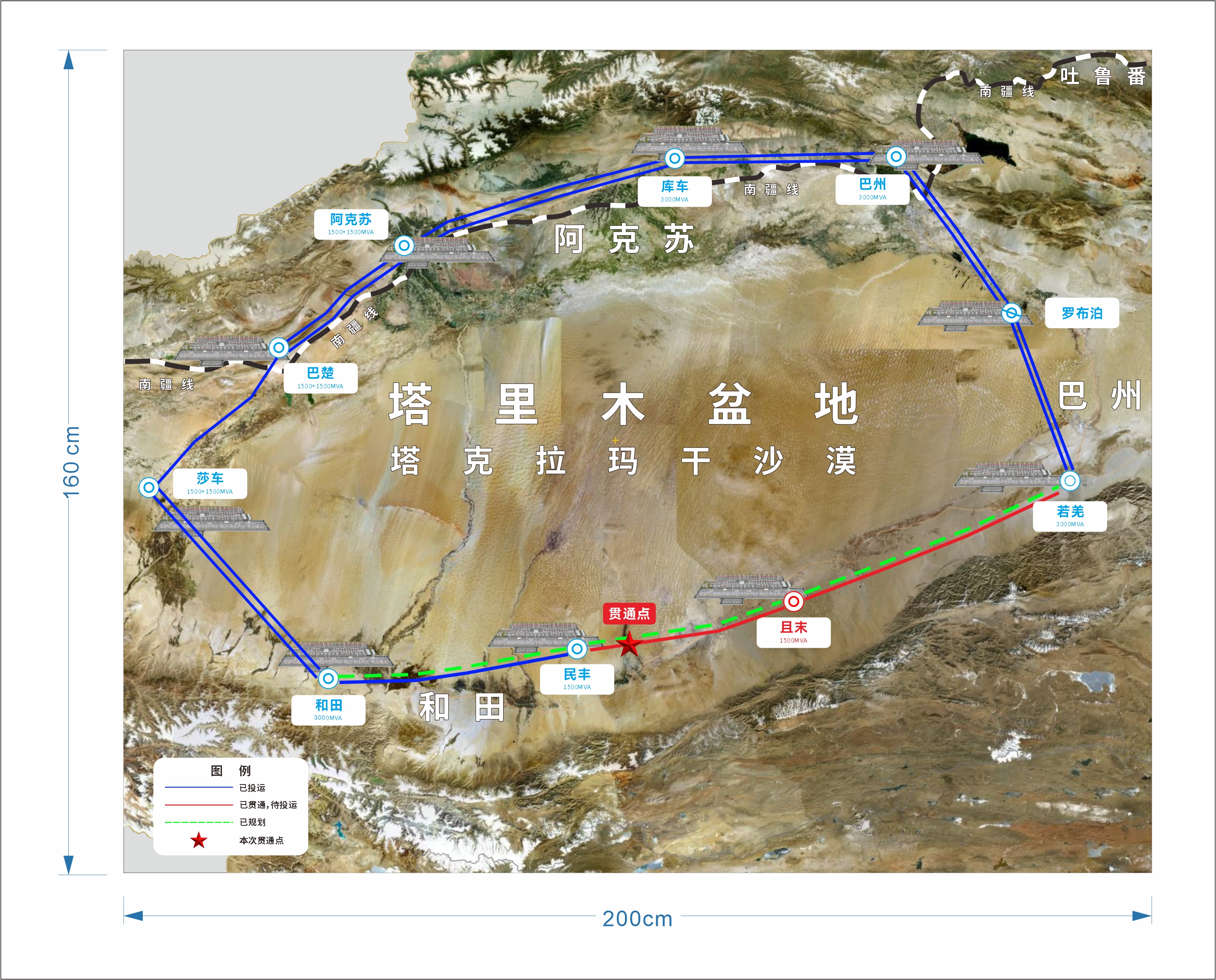 工程囊括面積達到53萬平方公里,建成後電網延伸涵蓋區域將達到106萬平方公里,接近我國陸地面積的九分之一。最後建設的和田-民豐-且末-若羌750千伏輸變電工程於2023年11月開工,超過一半線路在沙漠腹地,創造了全國沙漠路徑最長輸變電工程、全國單程線路路徑最長超高壓工程等紀錄。