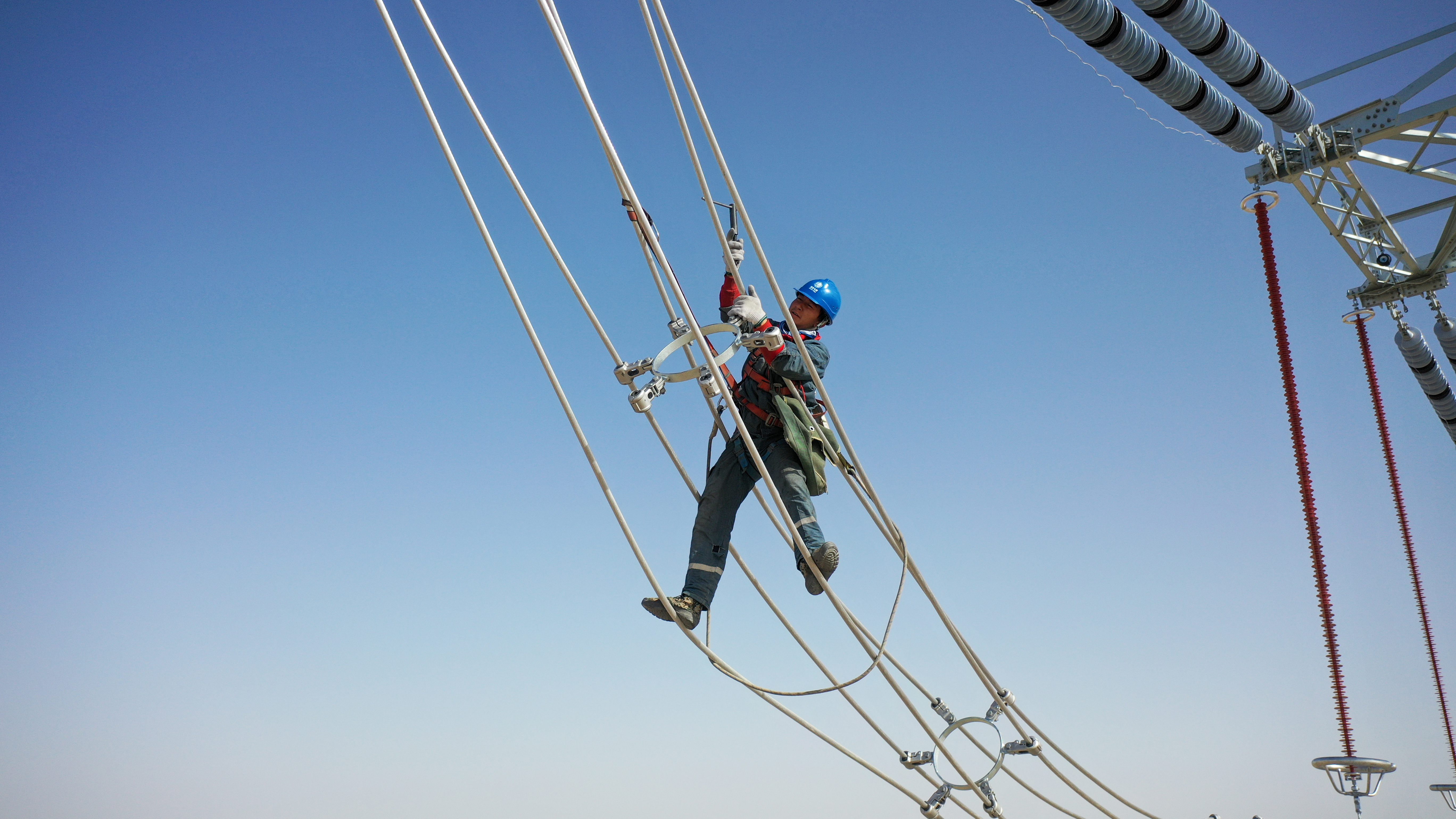 和田—民豐—且末—若羌750千伏輸變電工程線路上,電力員工開展安裝引流間隔棒。甄立民 攝