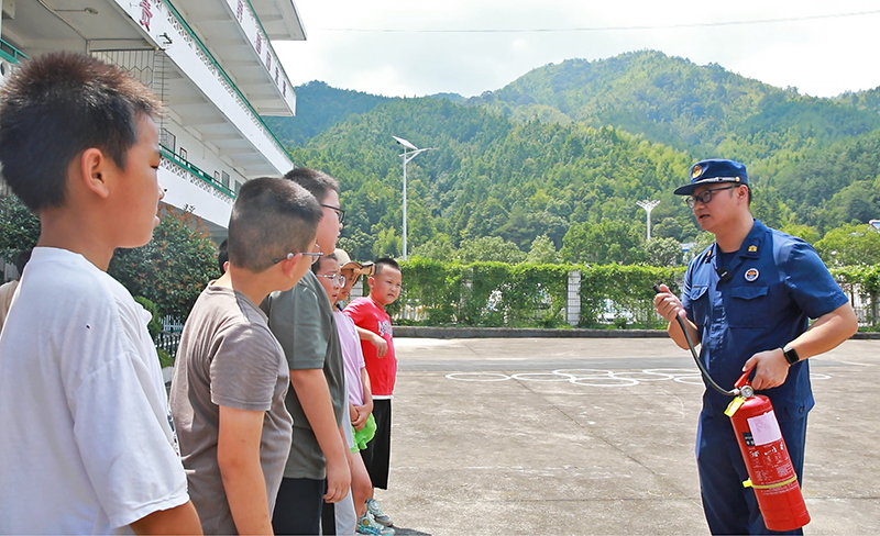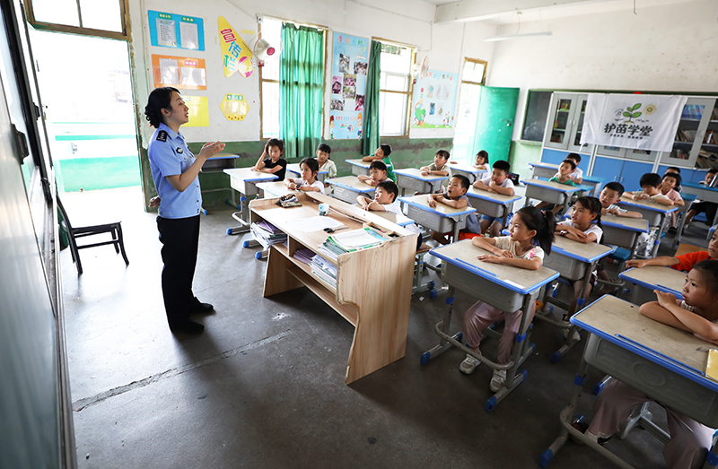 支教期間,各方社會力量積極參與,以青春之力護苗成長。圖為福建省永安市公安局羅坊派出所三級警長黃倩為孩子們科普反詐常識,提高他們的科學素養,有效防範詐騙行為。