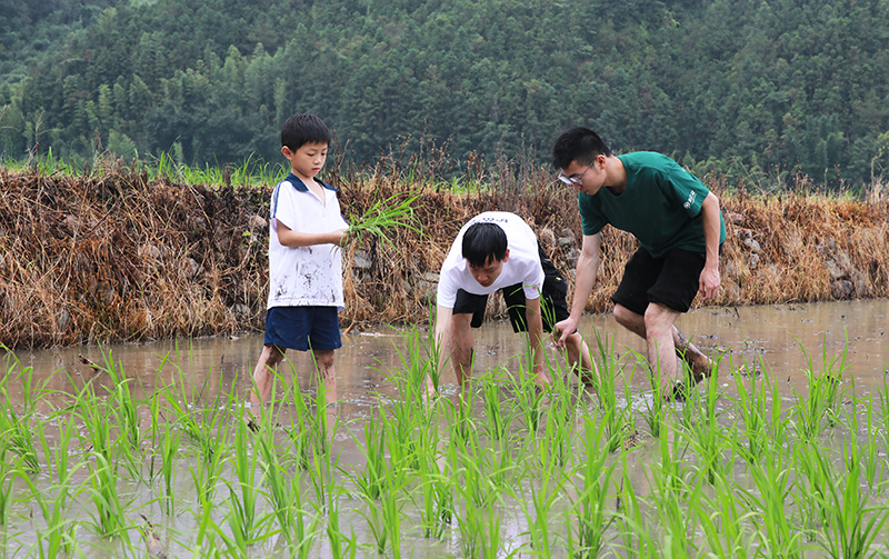 浙江大學大學生志願者和孩子們走進田間地頭,在“護苗學堂”勞動輔導員帶領下,學習插秧技術和水稻管理方法,體驗農耕文化,珍惜來之不易的糧食,在紅土地上播種希望,收穫成長。圖為大學生志願者和孩子一起體驗插秧。