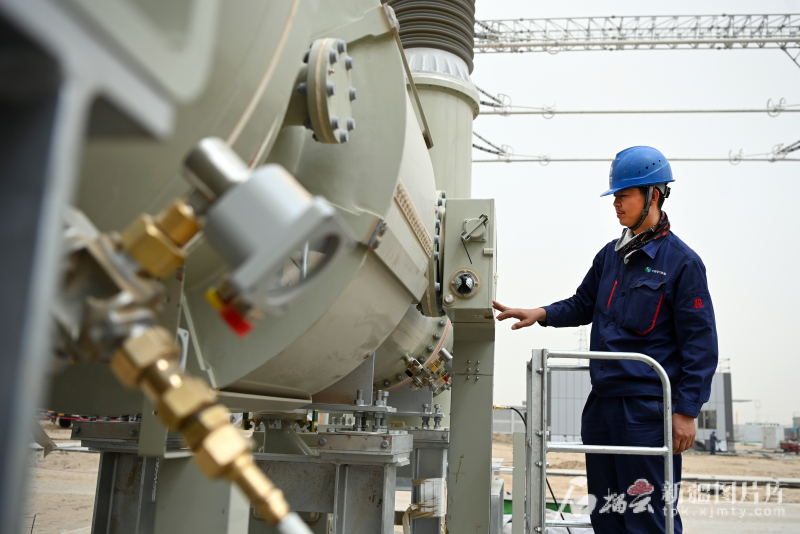 6月24日,且末750千伏變電站建設現場,塔吊旋轉運送設備,工人們正進行最後的調試。這座主體工程已完成近八成的變電站,今年年底投運後將與環塔線路形成呼應,徹底改變且末縣僅靠220千伏單迴路供電的歷史。