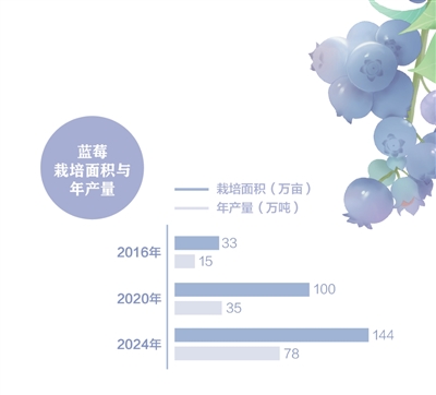 消費者“藍莓自由”的背後是迅速壯大的產業。數據顯示:2024年,我國藍莓栽培面積144萬畝,較2020年增加44萬畝,較2016年增加111萬畝;全國藍莓總產量78萬噸,分別比2020年和2016年增加43萬噸和63萬噸。