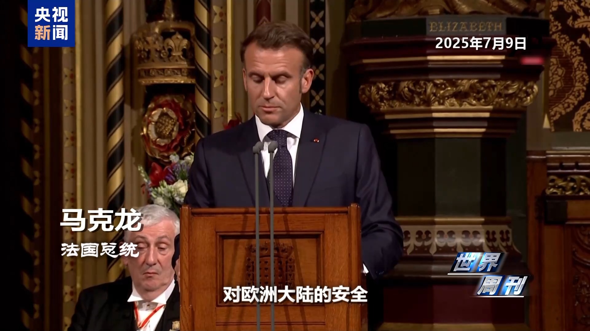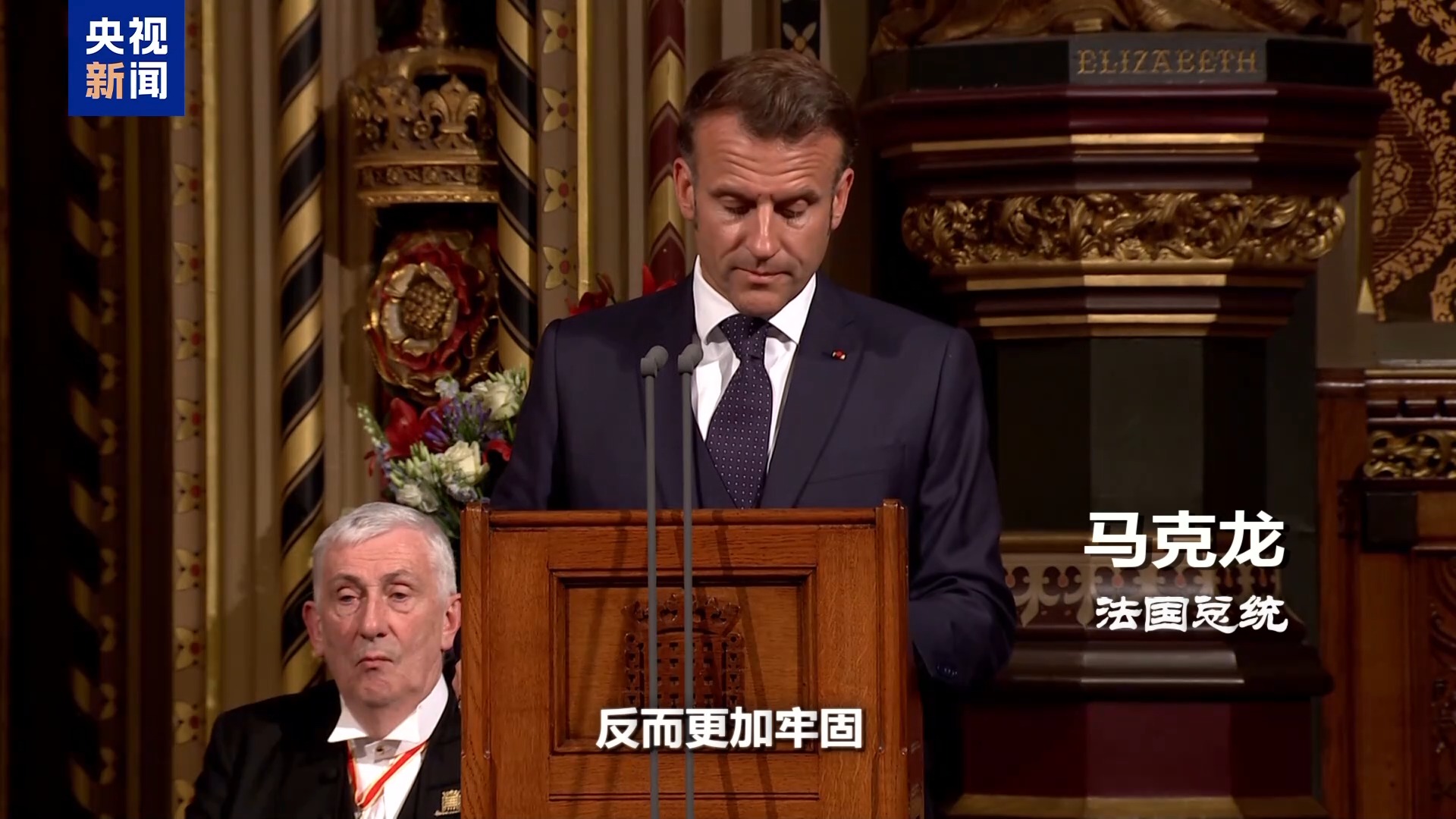 7月8日下午,在威斯敏斯特宮最大的房間皇家畫廊,馬克龍對英國議會發表演講。馬克龍表示:手牽手,肩並肩,這是英法的共同命運。