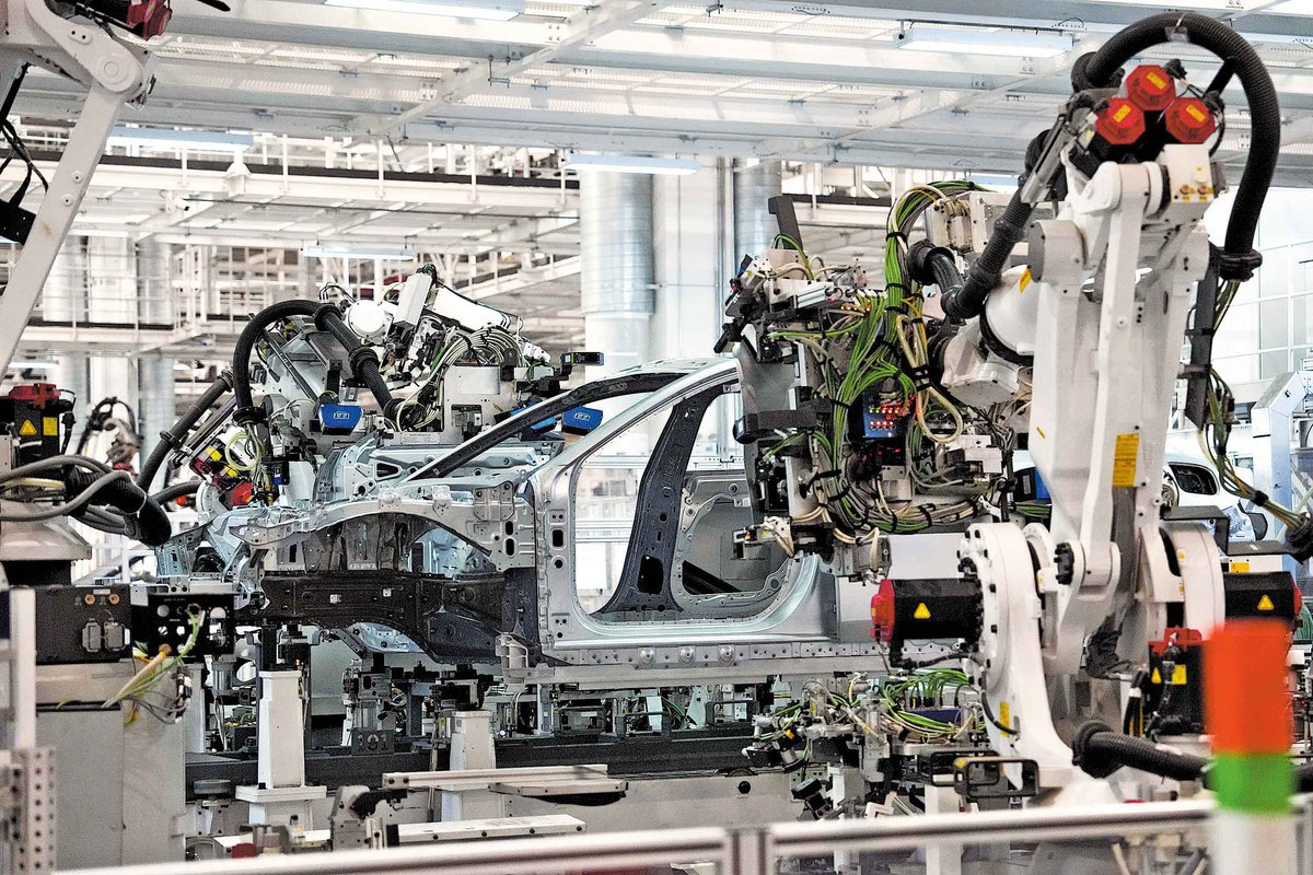 一輛汽車正在北京一條自動化生產線上進行組裝。圖片來源:新華社