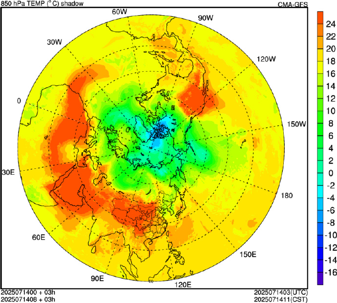 今年夏季高温,從下圖所示的同一時間的500百帕上副熱帶高壓中心的分佈,和850百帕上高温區域的分佈看非常吻合。就足以説明,目前北半球多地發生的高温事件明顯是副熱帶高壓“作祟”的結果。當然,有人也可以描述其中極端高温區域存在“熱穹頂效應”。