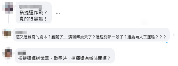 台軍這一演習項目,在島內也引起一些網民的議論,有人在社交媒體臉書留言表示,“搭捷運作戰?真的很黑熊!”“這又是誰寫的劇本?蠢斃了……演習第幾天了?進程到那一段了?還能有大眾運輸?”“搭捷運運送武器,戰爭時,捷運還有辦法開嗎?”