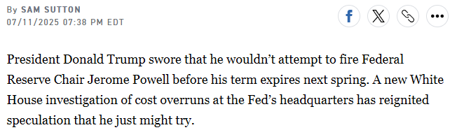 對於是否會更換美聯儲主席,特朗普的態度一直在變化。僅拿他7月的言論舉例,7月2日,特朗普在社交媒體上發帖稱,“太遲先生”鮑威爾應該立即辭職。
