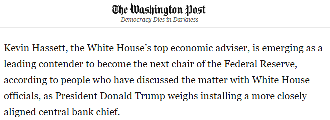 值得一提的是,這次“出頭”向鮑威爾發難的哈塞特,據稱也是特朗普眼裏下任美聯儲主席的潛在人選。美國《華盛頓郵報》稱他“在下任美聯儲主席的競爭中領先”。