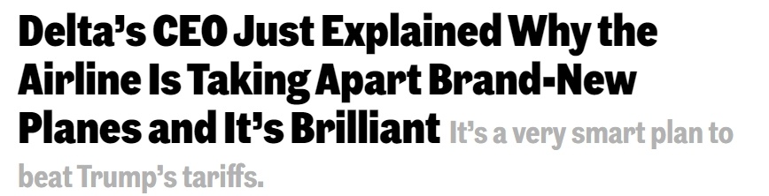 美國《公司》雜誌的科技專欄作家傑森·艾滕認為,達美航空實際上是將其無法投入使用的新飛機當作昂貴的發動機供應商。這也體現了全球供應鏈和貿易政策對公司經營的影響。在這種情況下,達美航空的做法不僅是為了解決供應問題,更是在與政府關税政策進行一場角力。
