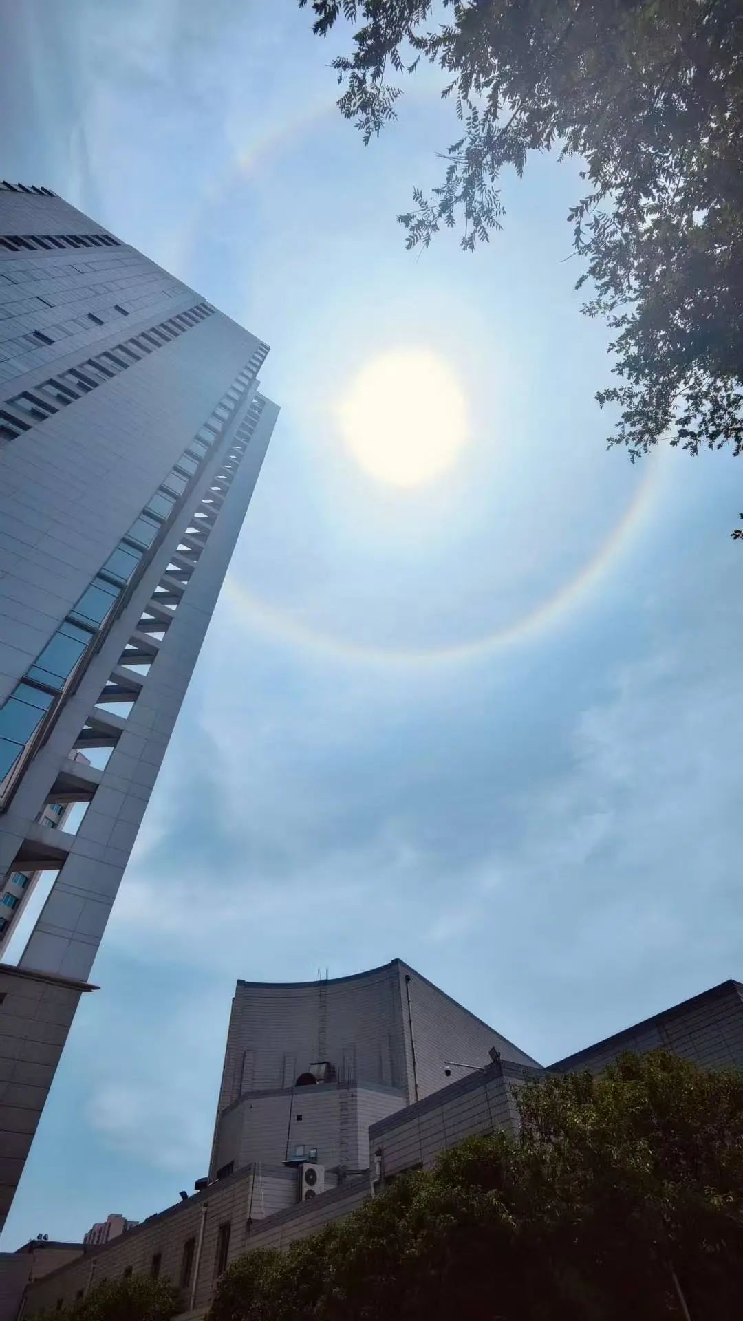 提醒市民:仰望日暈奇觀時務必躲在陰涼處,戴墨鏡防護+及時補水,謹防熱射病!