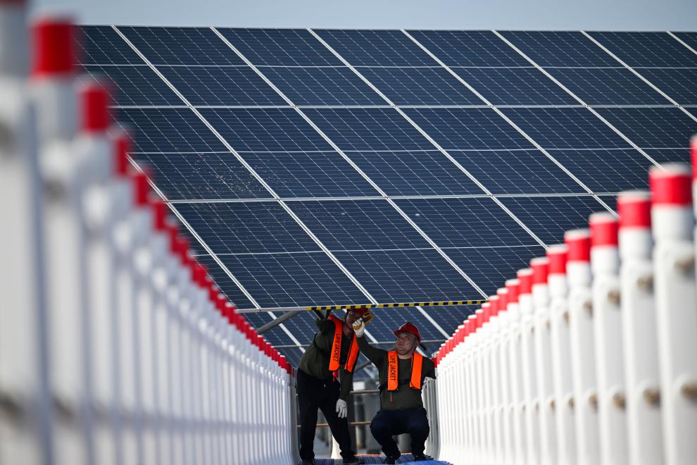 7月10日,在國家能源集團天津龍源新能源有限公司渤化光伏電站,工作人員在檢查光伏發電板。新華社記者趙子碩 攝