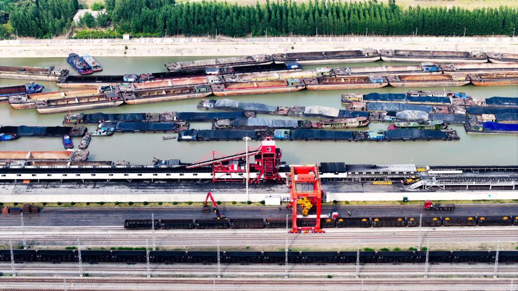6月8日,在濟寧港航梁山港,船舶停靠等待裝運煤炭(無人機照片)。新華社記者郭緒雷 攝