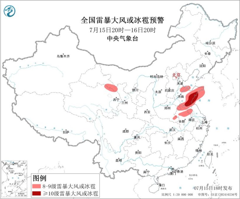 預計7月15日20時至16日20時,黃淮、江淮等地的部分地區將有8級以上雷暴大風或冰雹天氣,其中,山東中東部和南部、江蘇北部等地的部分地區將有10級以上雷暴大風,最大風力可達11級以上;黃淮、江淮、江南地區東部、西南地區南部、東北地區東部、西北地區東北部等地的部分地區將有小時雨量大於20毫米的短時強降水天氣,其中,山東中東部和南部、河南南部、安徽北部、江蘇北部等地的部分地區小時雨量大於50毫米,最大可達60毫米以上(見圖2)。強對流的主要影響時段為今天后半夜至明天白天。