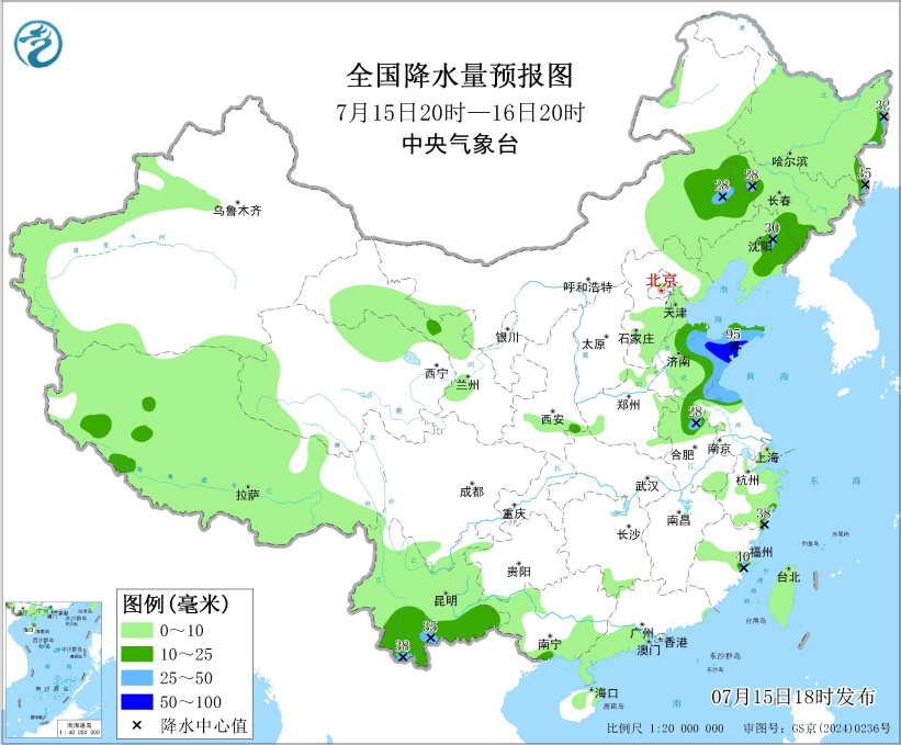 *7月15日20時至16日20時,*內蒙古東南部、吉林東部和西部、遼寧東部、山東半島、蘇皖北部、雲南南部等地部分地區有中到大雨,山東東部的部分地區有暴雨(50~95毫米)(見圖3)。