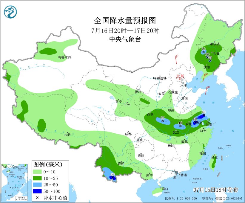 圖4 全國降水量預報圖(7月16日20時-17日20時)
