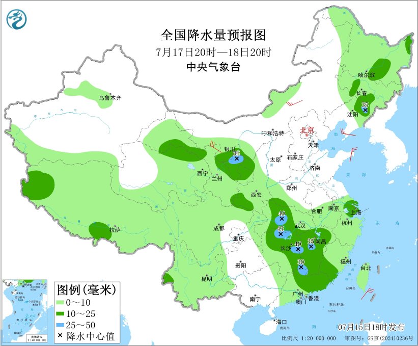 *7月17日20時至18日20時,*黑龍江中部、吉林中部、遼寧北部、寧夏、內蒙古西部、甘肅河西和東部、湖北中西部和南部、湖南北部和東部、江西大部、廣東中東部等地的部分地區有中到大雨(25~45毫米)。內蒙古中西部、甘肅河西等地的部分地區有4~6級風(見圖5)。